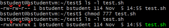 이제 프로그램을 작성했으니 실행을 하겠습니다...만 sh파일은 처음 만들면 실행 권한이 없으므로 파일에 실행 권한을 주겠습니다