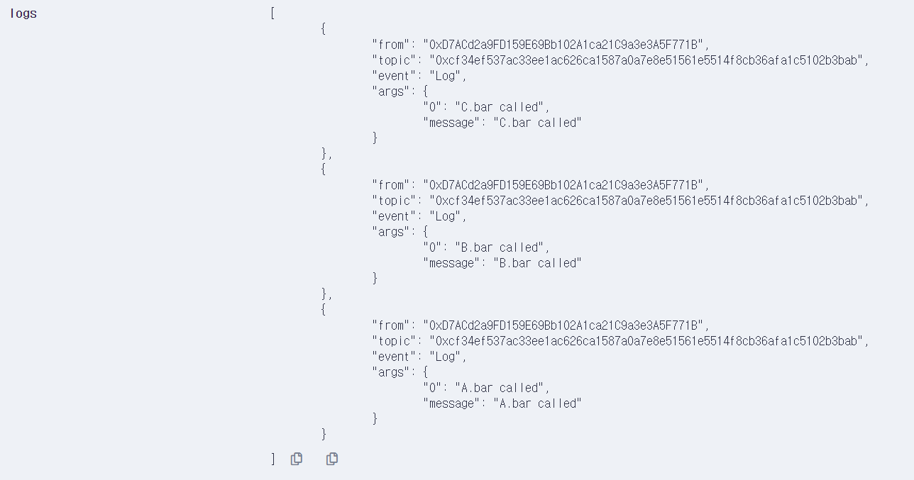 그런데 문제는 D컨트랙트의 bar함수인데, bar함수를 실행시켜보면 아래와 같은 로그가 나온다